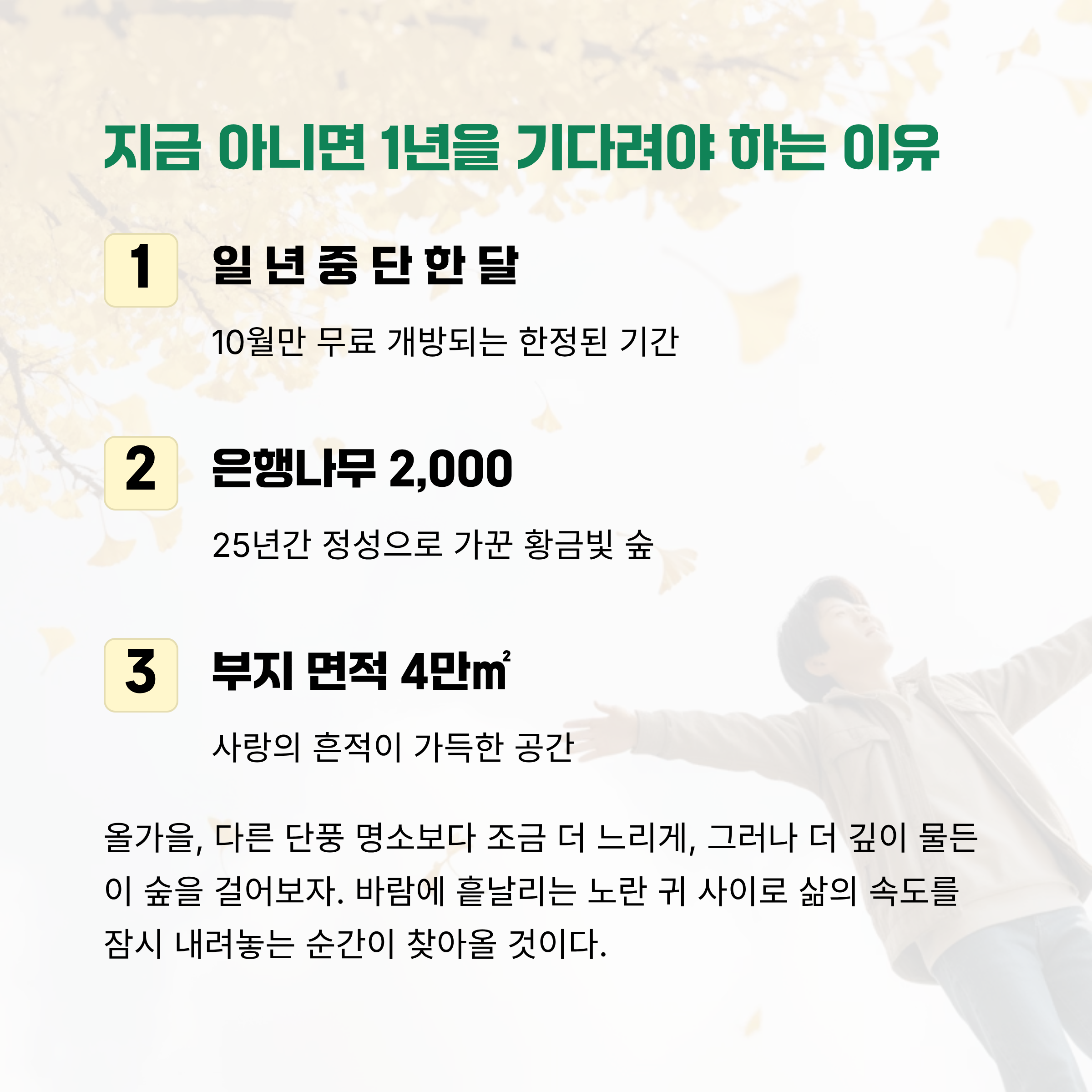 바람에 흩날리는 노란 잎사귀 사이로 삶의 속도를 잠시 내려놓는 순간이 찾아올 것이다.