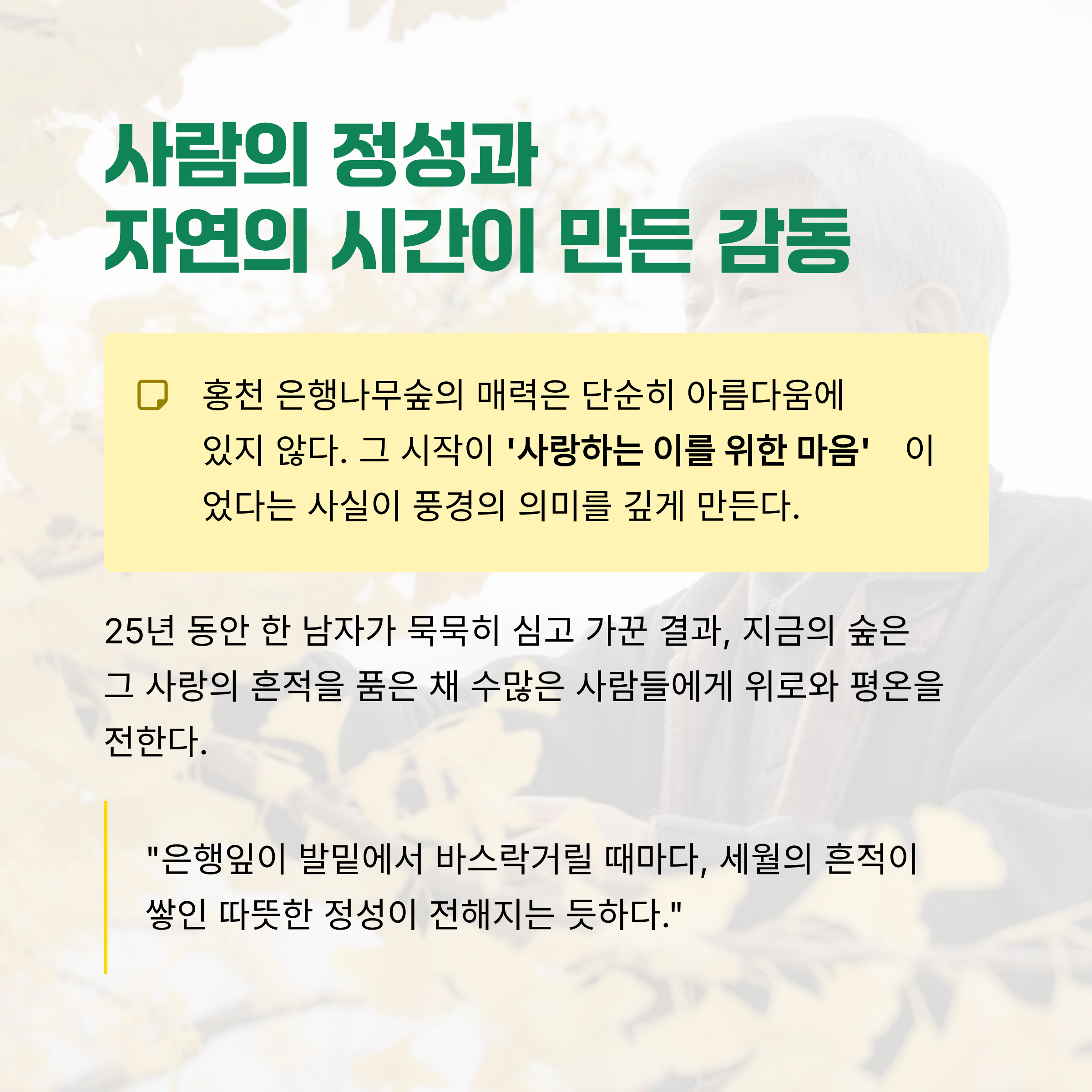 지금의 숲은 그 사랑의 흔적을 품은 채 수많은 사람들에게 위로와 평온을 전한다.