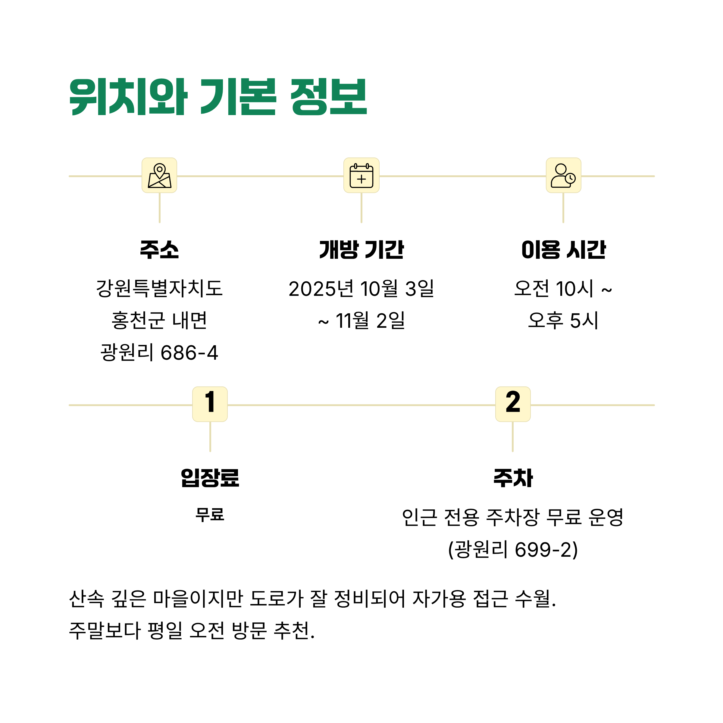 - 주차: 인근 전용 주차장(광원리 699-2, 무료 운영)