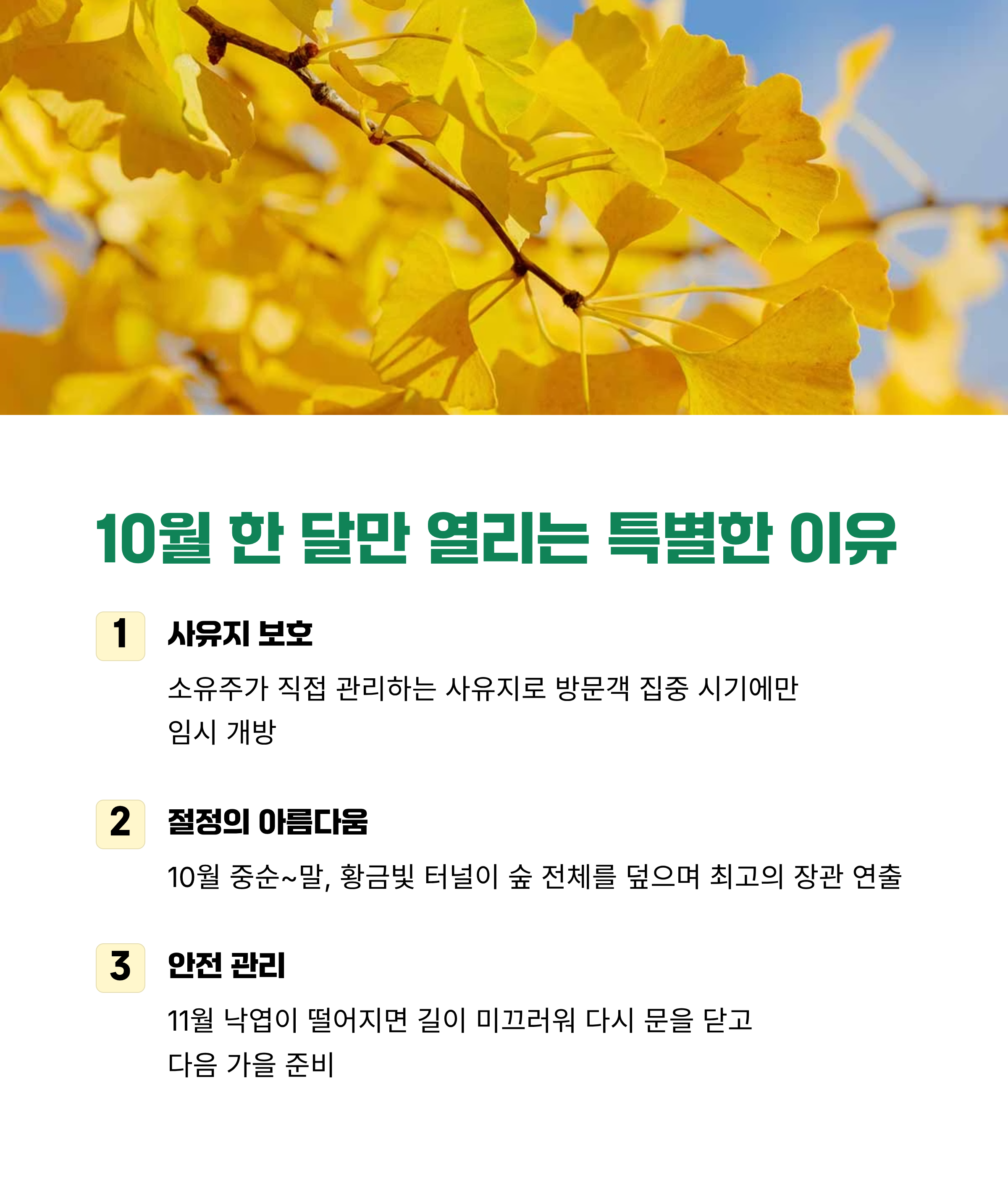 홍천 은행나무숲이 매년 10월에만 열리는 이유는 자연 보호와 안전 때문이다.