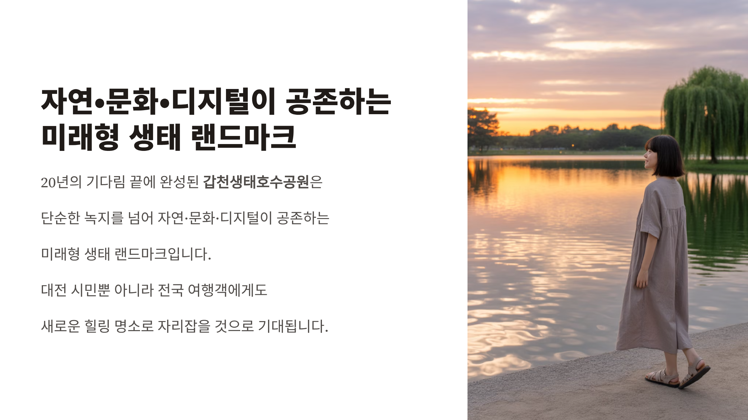 20년의 기다림 끝에 완성된 갑천생태호수공원은 단순한 녹지를 넘어 자연·문화·디지털이 공존하는 미래형 생태 랜드마크입니다.