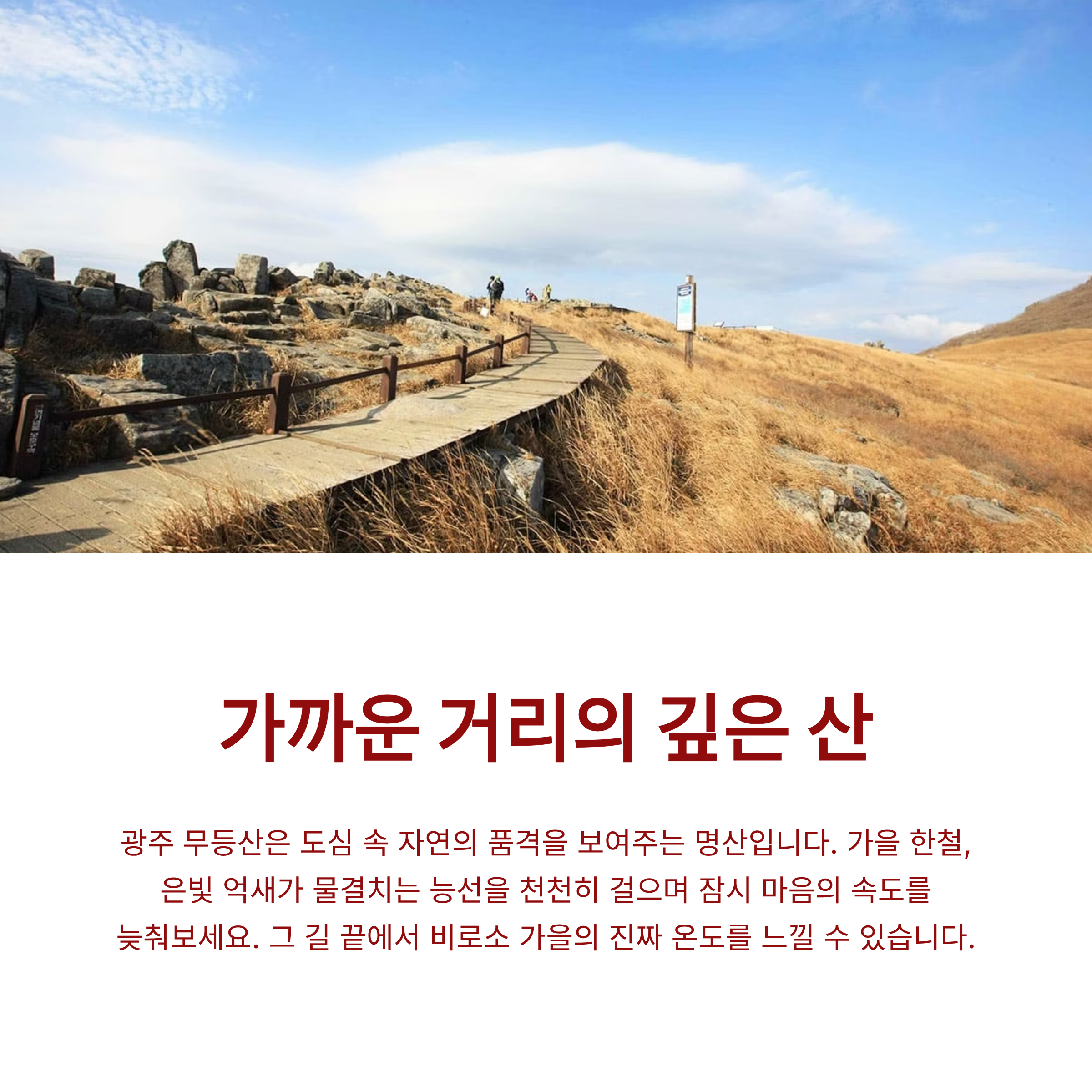 | 대표 코스 | 증심사 지구 | 증심사 – 중머리재 – 장불재 – 서석대 | 약 4시간 | 억새 절정, 풍경 압도적 |