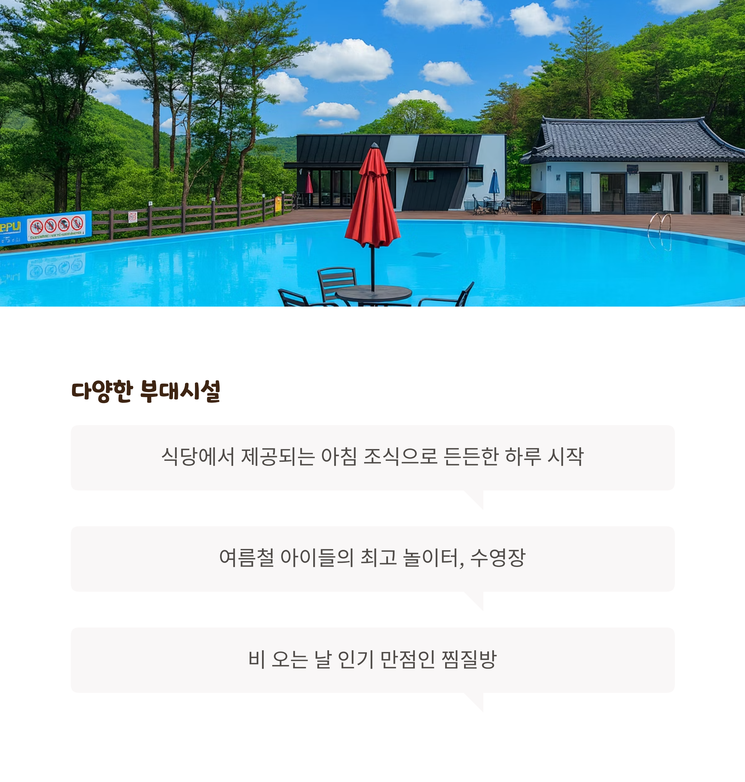 휴양마을 내에는 식당, 수영장, 찜질방 등 다양한 부대시설이 운영 중입니다. 특히 찜질방은 비 오는 날에