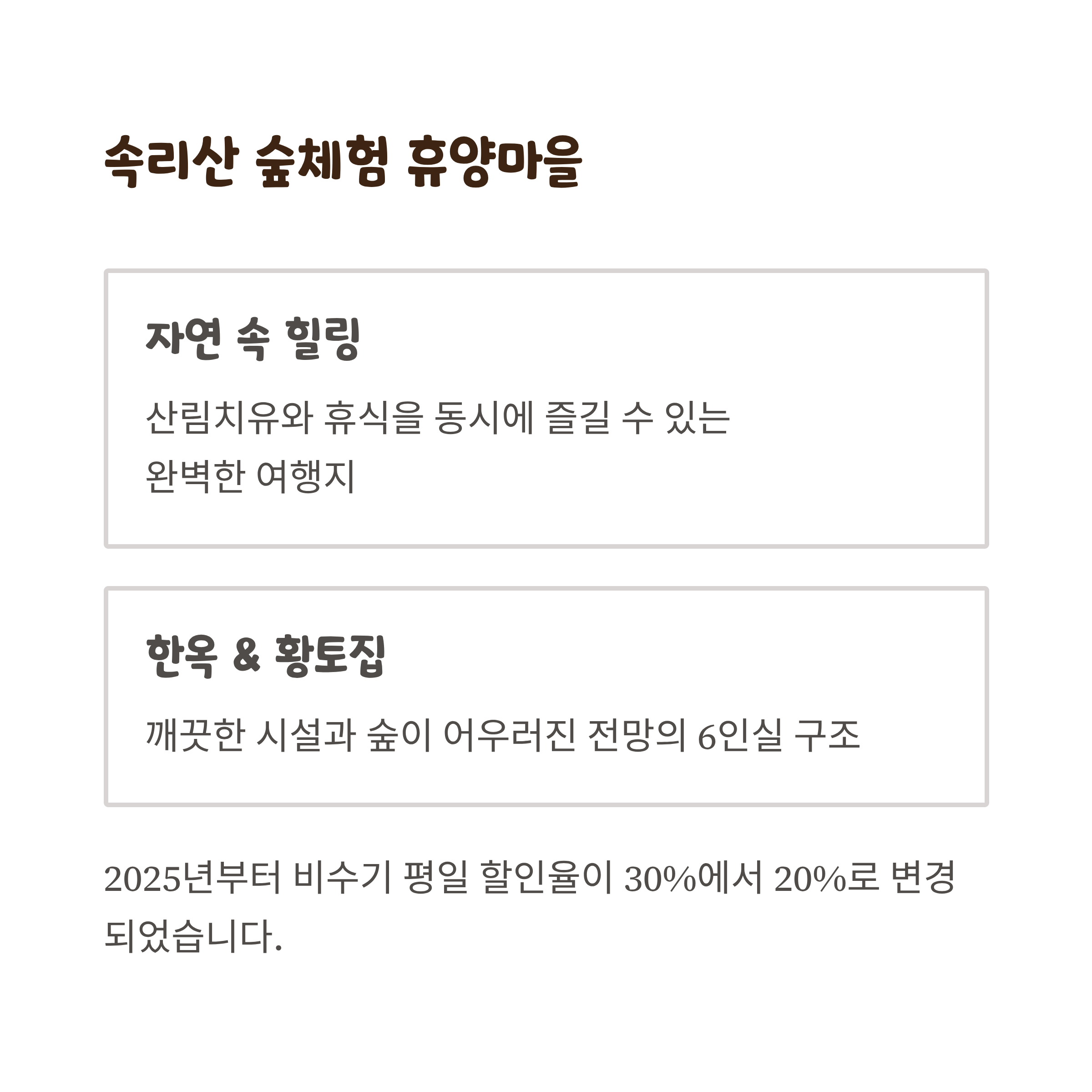 2025년부터 숙박료 할인 정책이 일부 변경되어, 비수기 평일에는 기존 30%에서 20%로 조정되었습니다. 주말보다는 평일에 여유 있게 다녀오는 걸 추천드리며, 성수기에는 조기 예약이 필수입니다.