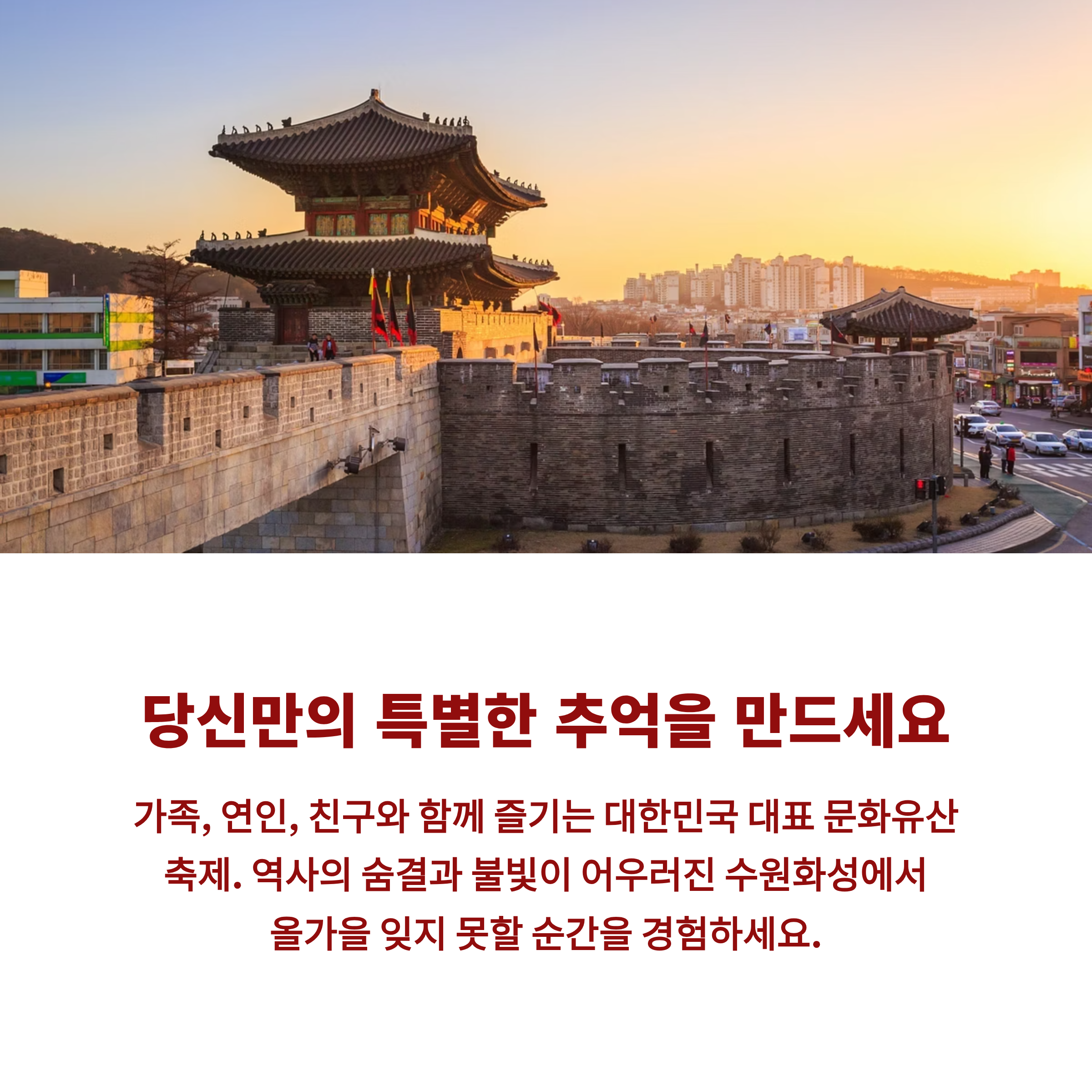 | 야간 콘텐츠 | 화성행궁 야간개장, 수원판타지 야조 | 전통 조명·음악·불꽃이 어우러지는 대형 야간공연 |
