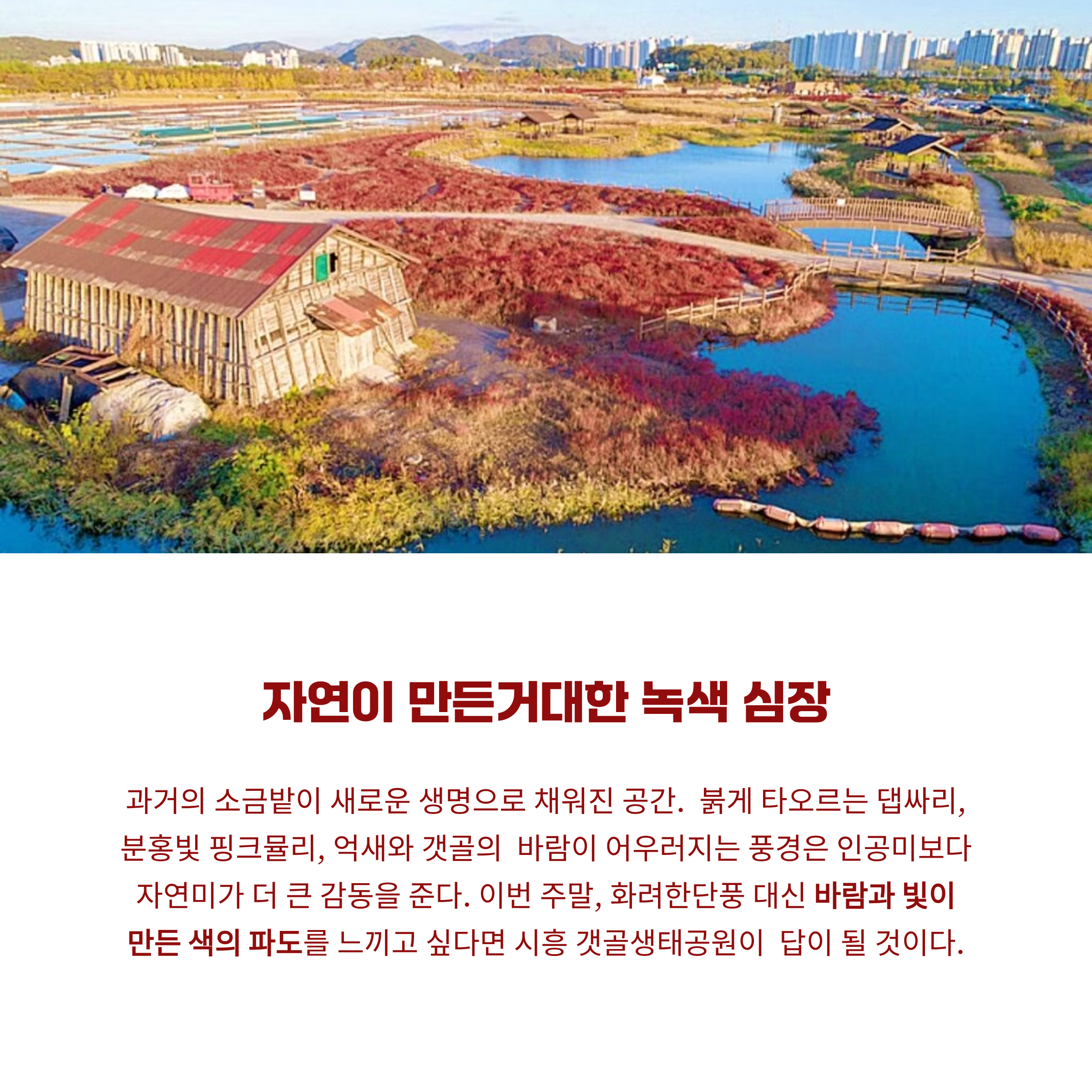이번 주말, 화려한 단풍 대신 바람과 빛이 만든 색의 파도를 느끼고 싶다면 시흥 갯골생태공원이 그 해답이 될 것이다.