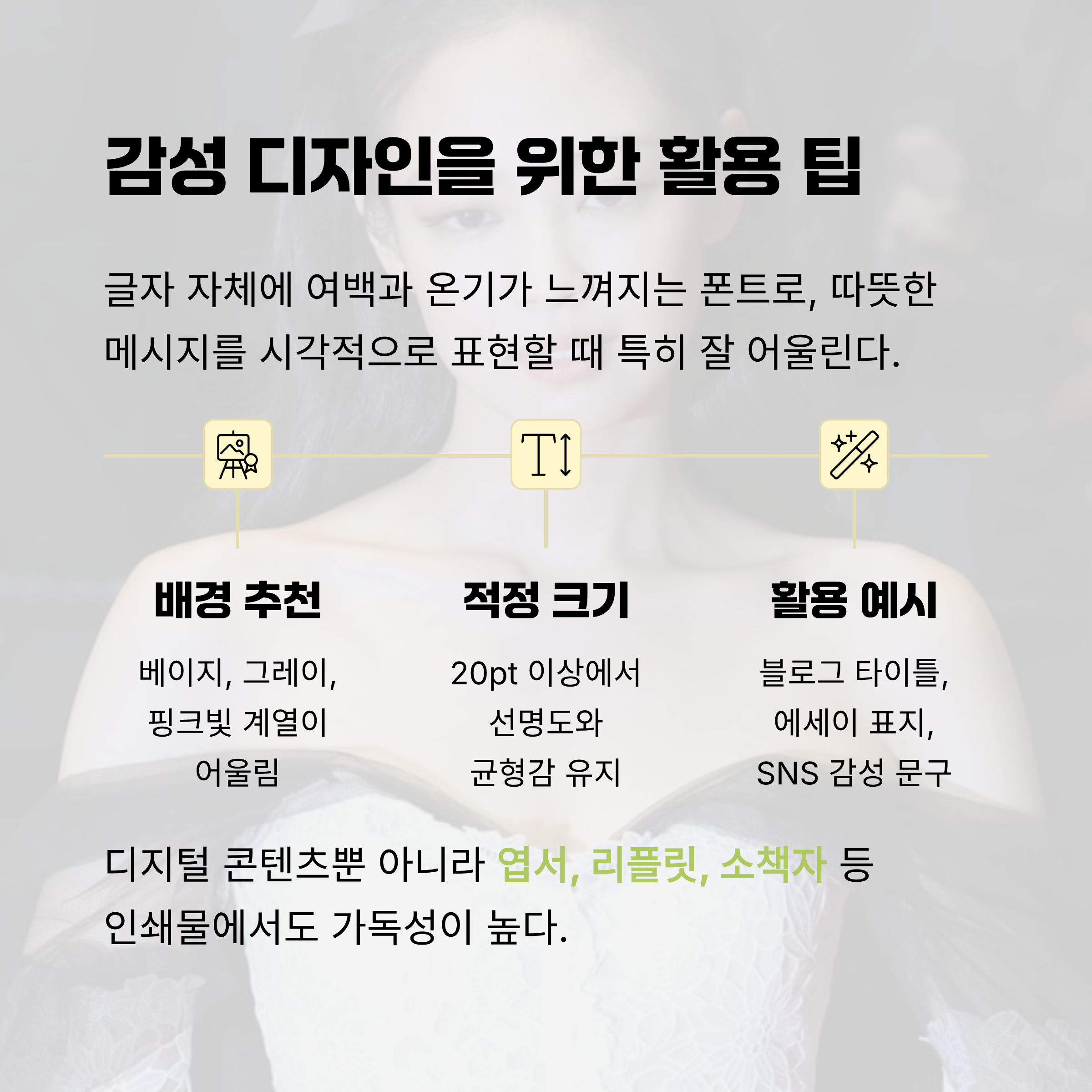 짙은 감정이 담긴 문장이나 따뜻한 메시지를 시각적으로 표현할 때 특히 잘 어울린다.