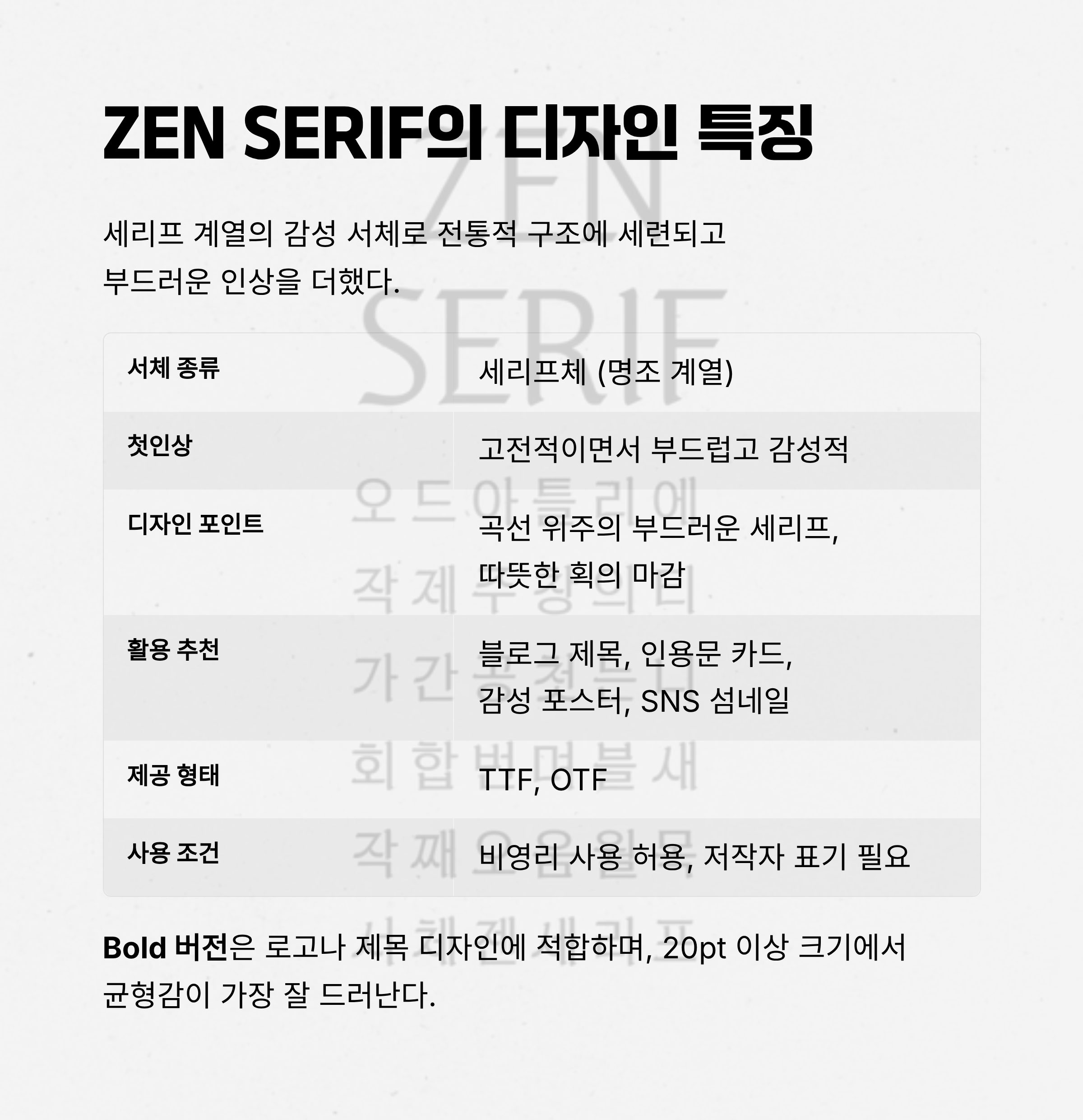 ZEN SERIF는 세리프 계열(명조체 기반)의 감성 서체다.