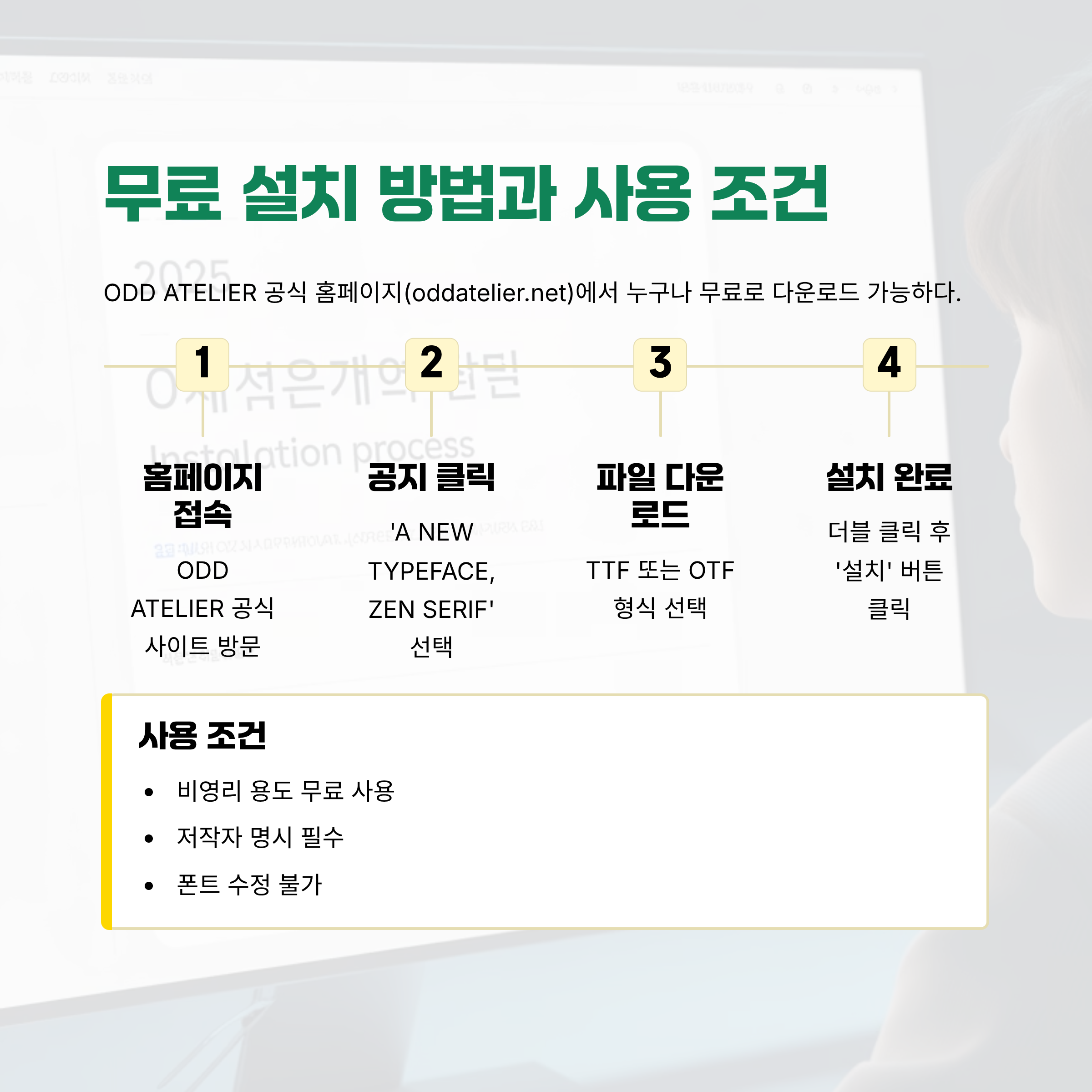 ZEN SERIF는 ODD ATELIER 공식 홈페이지(oddatelier.net)에서 누구나 무료로 내려받을 수 있다.