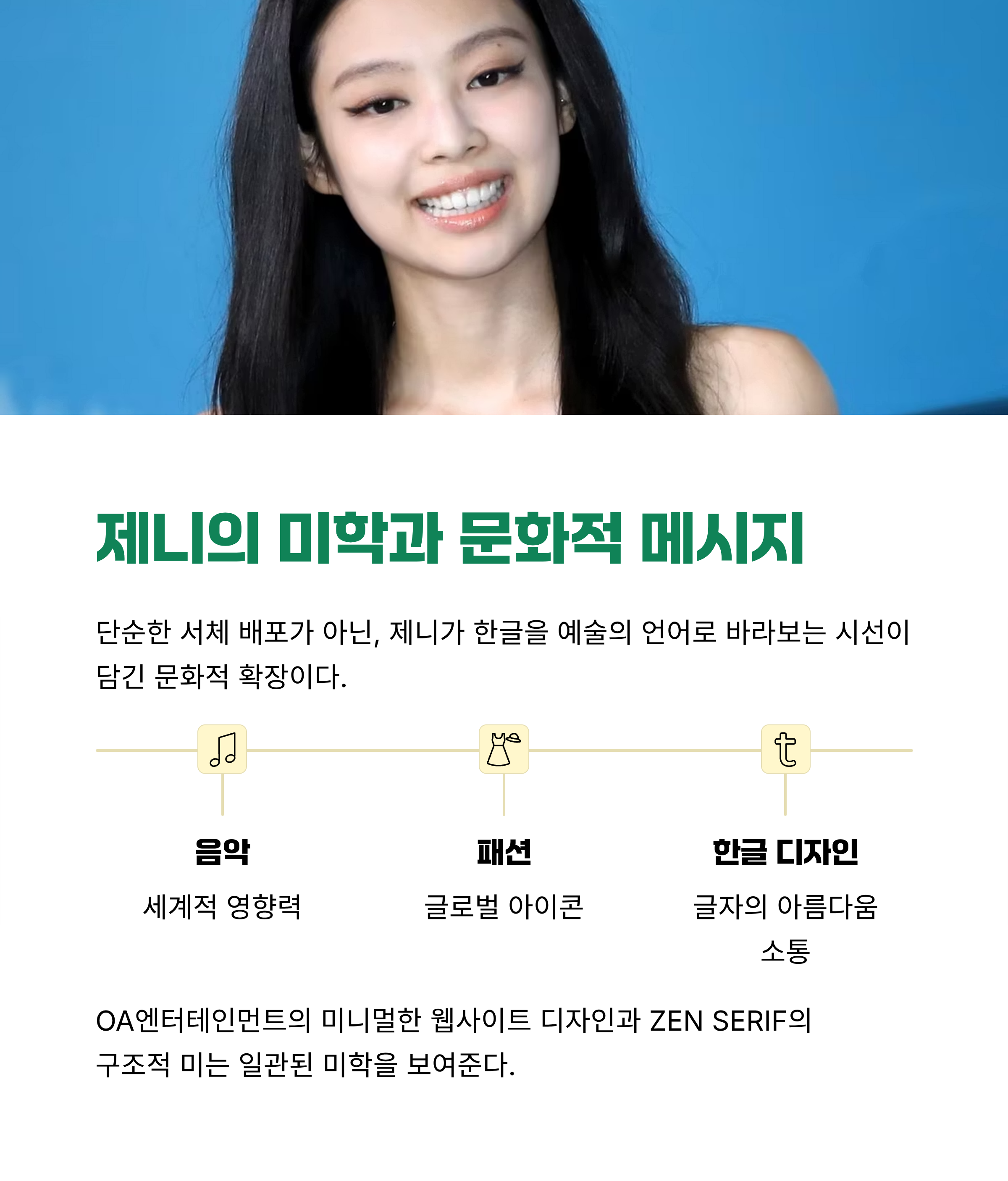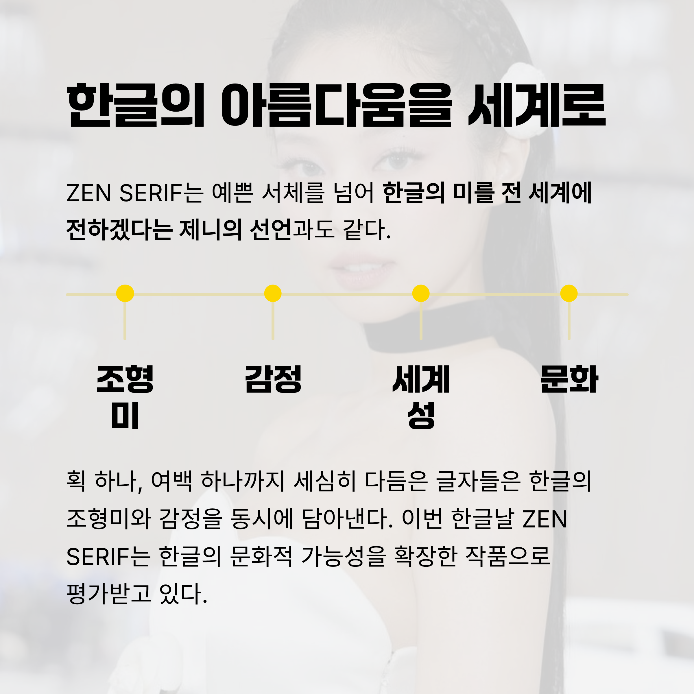 ZEN SERIF는 단순히 예쁜 서체를 넘어 ‘한글의 미’를 전 세계에 전하겠다는 제니의 선언과도 같다.