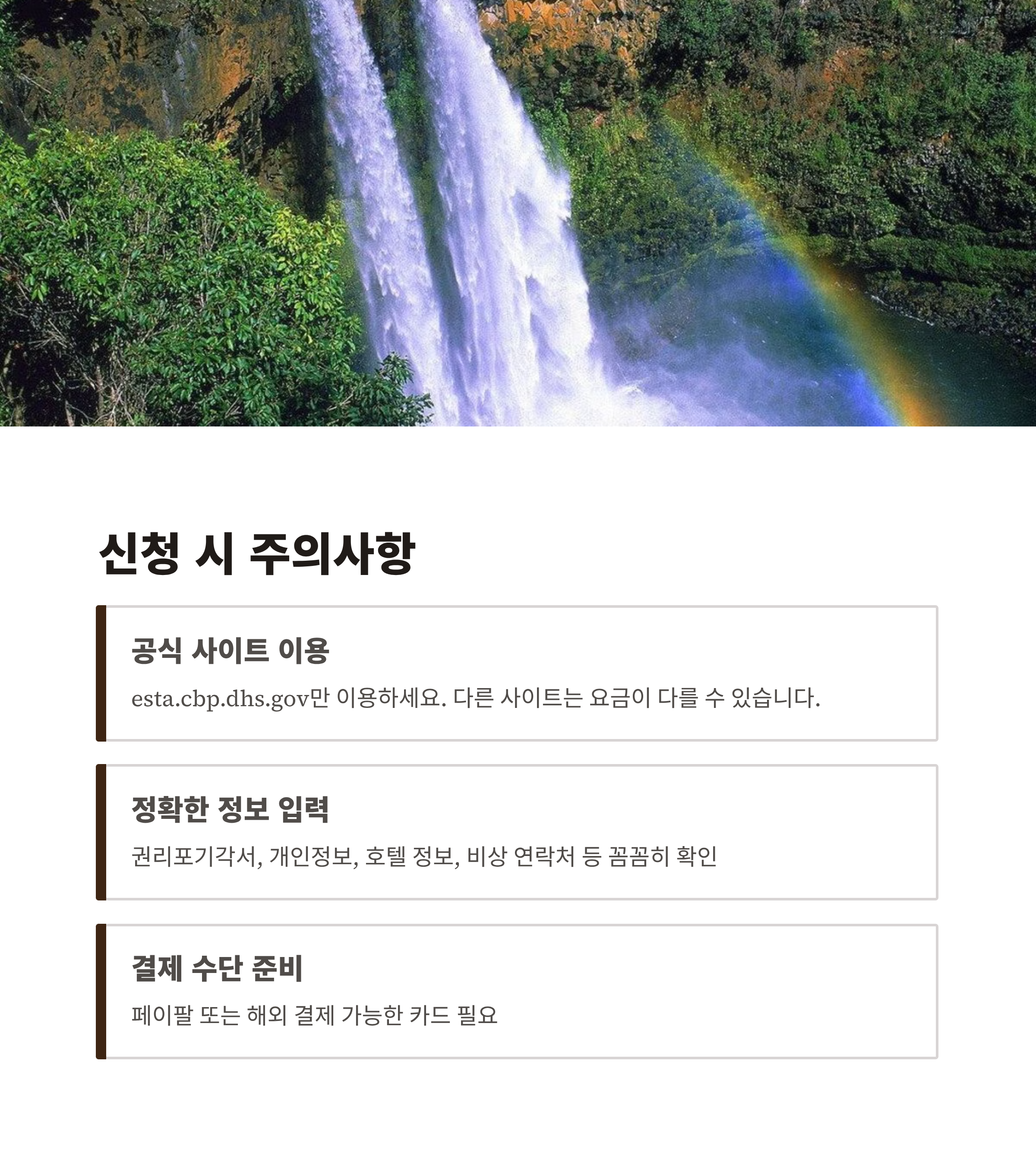 ESTA는 단순한 형식 절차가 아니라 실제 입국 허가 여부와 직결되는 만큼 꼼꼼히 준비해 두세요.
