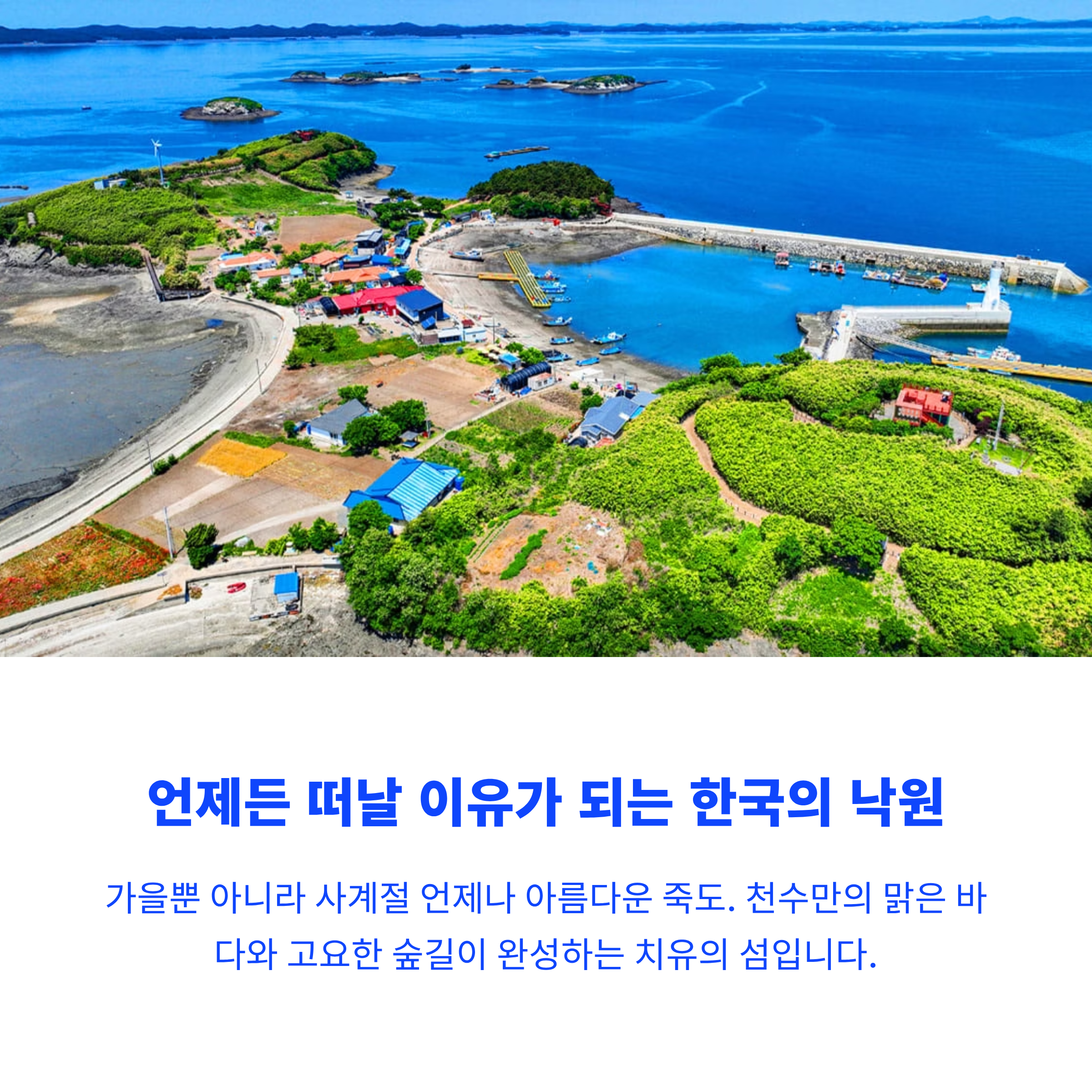 복잡한 계획이 없어도, 특별한 준비가 없어도 좋습니다. 그저 배를 타고 섬에 오르는 순간, 천수만의 맑은 바다와 고요한 숲길이 여행을 완성해 줍니다. 걷고, 보고, 머무는 것만으로도 충분한 치유의 섬. 죽도는 가을뿐 아니라 언제든 떠날 이유가 되는 한국의 낙원입니다.