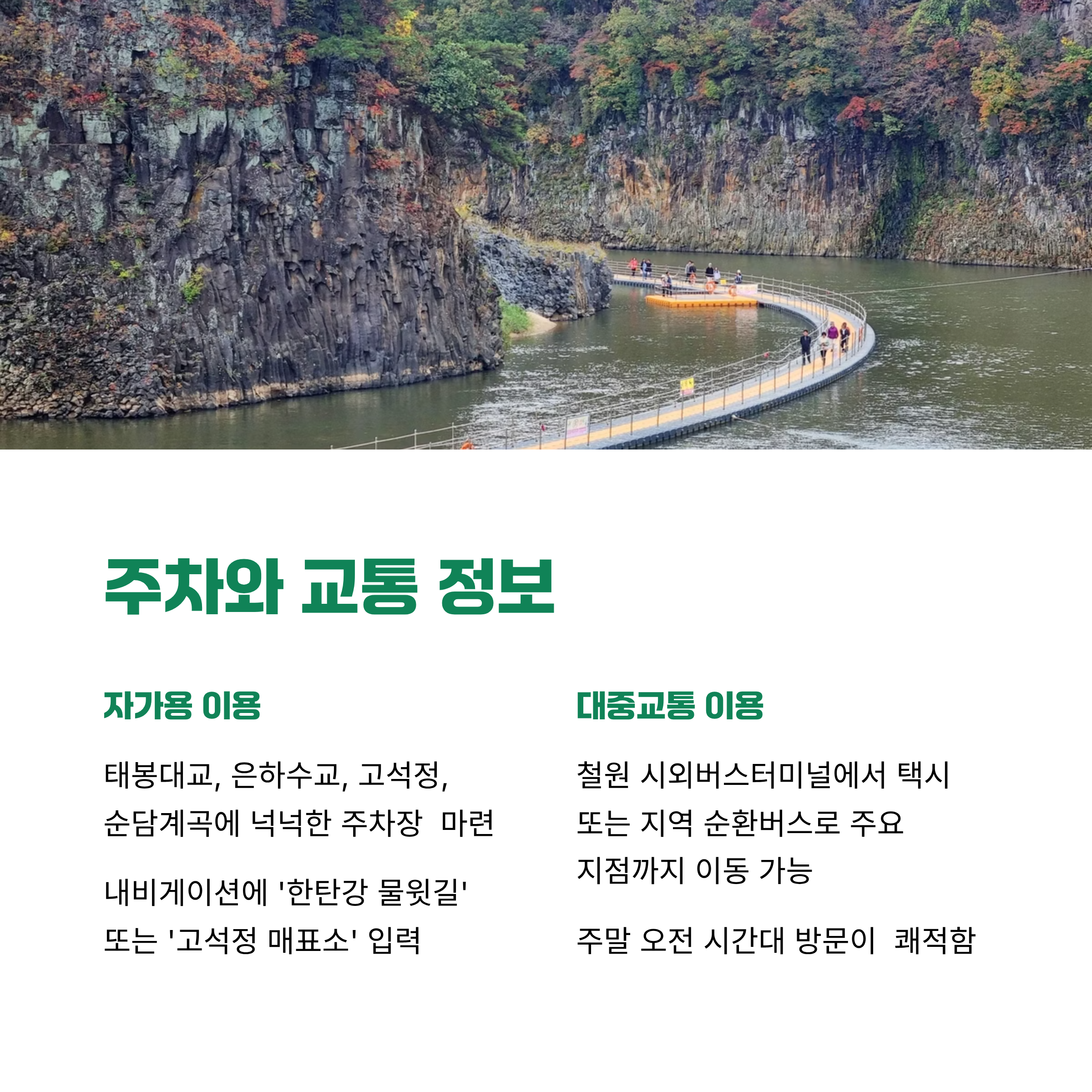 자가용 이용 시 진입이 비교적 수월하며, 내비게이션에 ‘한탄강 물윗길’