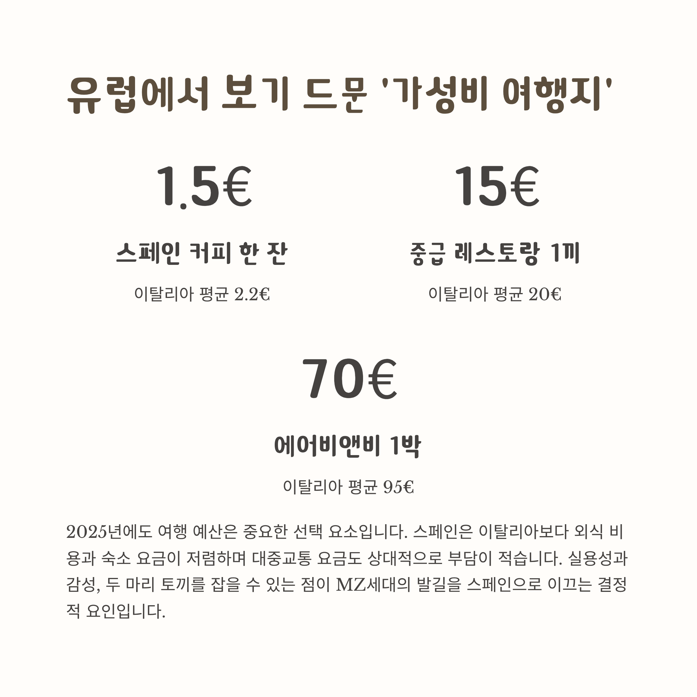 스페인은 이탈리아보다 외식 비용과 숙소 요금이 저렴하며
