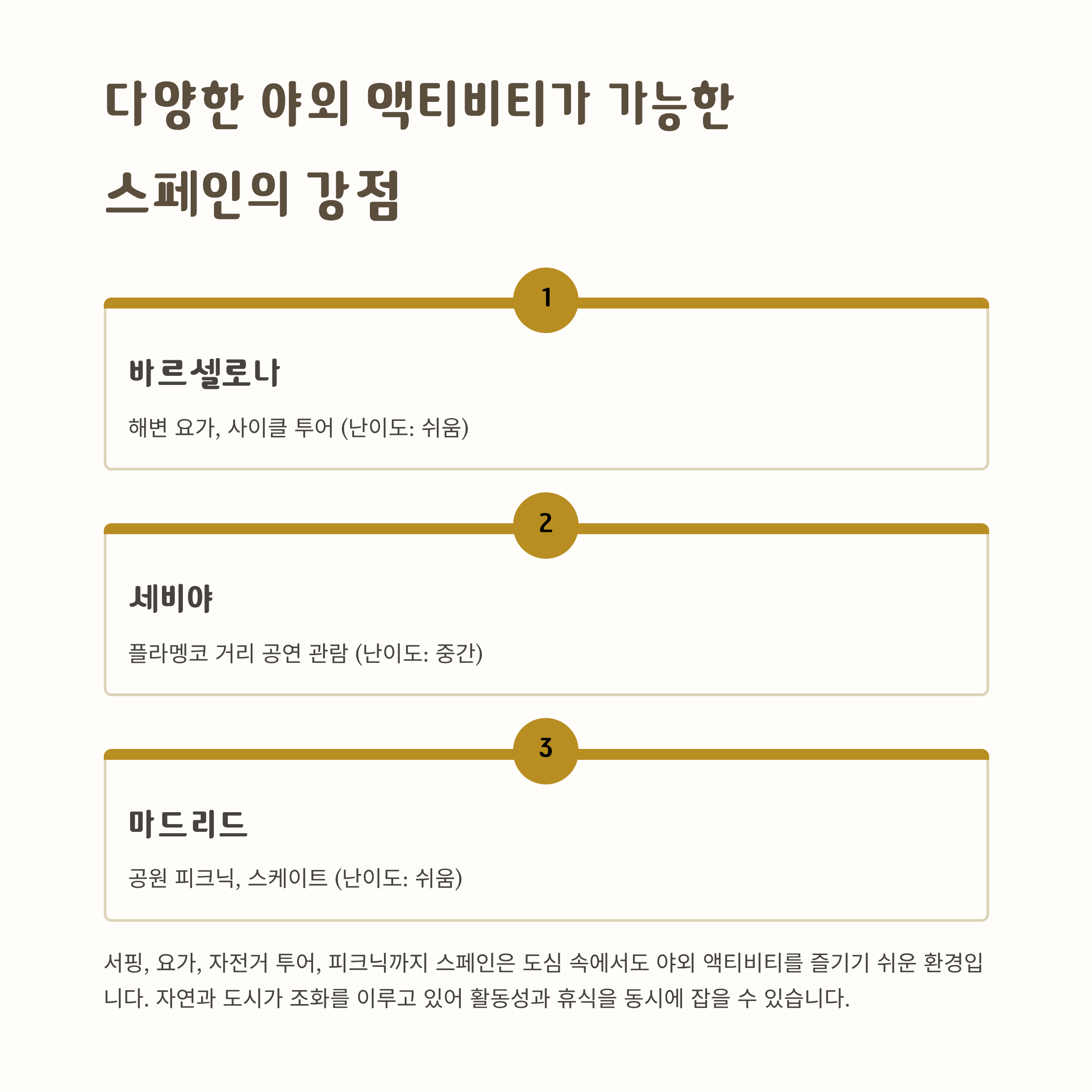 스페인은 도심 속에서도 야외 액티비티를 즐기기 쉬운 환경입니다.